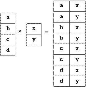 5. Операция декартово произведение. Декартовым произведением двух отношений А и В называется множество всех кортежей, которые являются конкатенацией (соединением в цепочки) некоторого кортежа а, принадлежащего А, и кортежа b, принадлежащего В (рисунок 10).