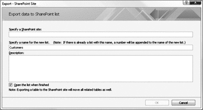 3. Для создания списка SharePoint в таблице Access выберите вкладку Внешние данные, затем нажмите ставшую доступной кнопку Список SharePoint в группе Экспорт. После этого необходимо указать узел SharePoint, на котором будет размещен этот список, заполнить диалоговое окно Экспорт – список SharePoint, показанное на рис. 31, или щелкнув таблицу правой кнопкой мыши и выбрав Экспорт данных в список SharePoint. Имейте в виду, что если таблица была дочерней, все родительские таблицы также будут экспортированы.