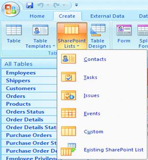 19. Шаблоны Access. В состав Access 2007 входит несколько готовых шаблонов, позволяющих пользователям быстро создавать бизнес-решения; для использования шаблонов необходимо нажать кнопку «Списки SharePoint» на вкладке «Создать» в группе «Таблицы» (см. рис. 35). При выборе одного из шаблонов автоматически определяется схема для таблицы, связанной с SharePoint. В настоящее время поддерживаются только контакты, задачи, вопросы и мероприятия. Это означает, что при экспорте таблицы с информацией одного из этих типов данные будут считаться соответствующим типом содержимого WSS (например, вопросы на вопросы).