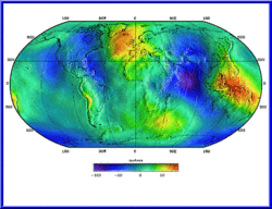 Видно, что поверхность Мирового океана на самом деле не всюду гладкая, например, на севере Индийского океана — понижена на ~100 метров, а на западе Тихого — поднята на ~80 метров