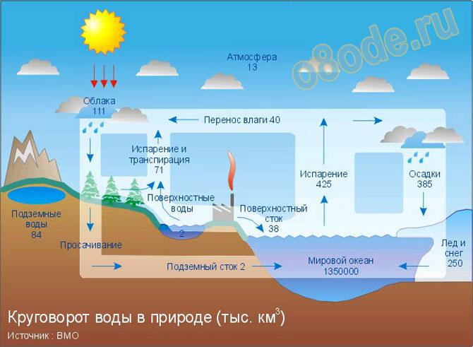 Часть выпавших осадков испаряется, часть просачивается в землю, образуя подземные воды, которые подземным стоком поступают в ручьи и реки и, таким образом, также возвращаются в океан. Этот замкнутый процесс обмена между атмосферой и земной поверхностью называется круговоротом воды в природе.