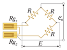| Оппозитная. 2 активных тензорезистора 3-х проводная схема включения Число тензорезисторов: 2 | | | e0 = (E /2)·Ks· ε0 Rg1.. деформация – ε0 Rg2.. деформация – ε0 R – постоянное сопротивление |