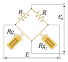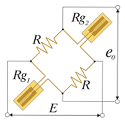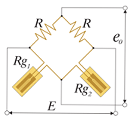 | Оппозитная. 2 активных тензорезистора 2-х проводная схема включения Число тензорезисторов: 2 | | | e0 = (E /2)·Ks· ε0 Rg1.. деформация – ε0 Rg2.. деформация – ε0 R – постоянное сопротивление |