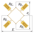 | 4 активных тензорезистора (для измерения суммарной деформации) Число тензорезисторов: 4 | | | e0 = (E /2)·Ks· ε0 ε0 = (ε1+ε2 + ε3+ε4)/2 R – постоянное сопротивление R = Rg1 = Rg2 = Rg3 = Rg4 |