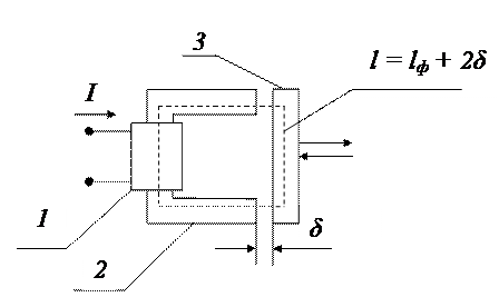 Упрощенная схема (модель) индуктивного ИП показанана рис. 3.6, где 1 – катушка, по которой протекает ток I; 2 и 3 – магнитопровод (ферромагнетик); 2 - неподвижная часть; 3 – подвижная часть, приближающаяся или отдаляющаяся от 2 под воздействием измеряемой величины, изменяя при этом воздушный зазор, размер которого δ; пунктир – средняя силовая линия магнитного потока; l – путь по средней силовой линии; lф –часть l, соответствующая прохождению по ферромагнетику (магнитопровду); 2 δ – часть пути, соответствующая прохождению по воздуху (дважды через воздушный зазор).