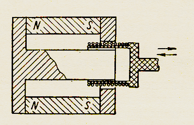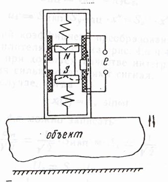Постоянный магнит с полюсными наконечниками висит на мягких пружинах и практически неподвижен относительно базы, а катушка вместе с объектом вибрирует относительно него; в ней на водится ЭДС, пропорциональная скорости вибрации. Уравнение для сил, приложенных к подвижной части, можно представить в виде
