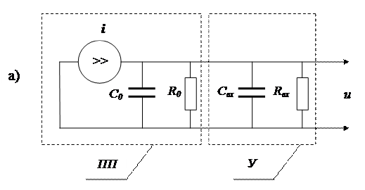 На рис. 3.19,а показана эквивалентная схема пьезоэлектрического преобразователя ПП вместе со входной цепью подключённого к нему усилителя У. Здесь С0 и R0 – ёмкость и сопротивление между гранями пьезоэлектрика, Свх и Rвх – входная ёмкость и входное сопротивление усилителя, а активный элемент ПП представлен источником тока, соответствующего (3.17). Этот ток преобразуется в напряжение u на входе усилителя.