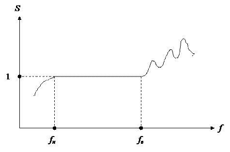 Ограничение со стороны высоких частот связано с механическими резонансными явлениями. Частотная характеристика преобразователя – зависимость чувствительности S от частоты f изменяющейся силы c неизменной амплитудой показана на рис. 3.20. Реальный частотный диапазон может быть, например, от нижней границы fн = 10 Гц до верхней границы fв = 10 кГц.