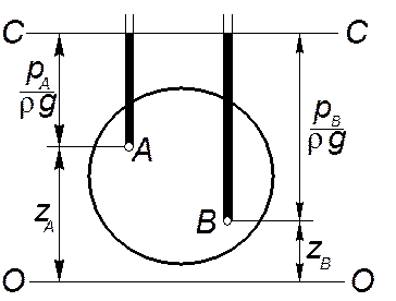 Представим герметично закрытый сосуд, заполненный жидкостью, находящейся под давлением. Выберем в этом сосуде две произвольно расположенные точки A и B и, опять-таки произвольно, горизонтальную плоскость O-O, которую назовем плоскостью отсчета.
