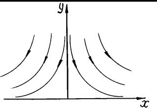 . Следовательно, линии тока - гиперболы, для которых оси x и y - асимптоты. На рис. 6.5 показаны линии тока для верхней половины. Если считать, что оси координат являются твердыми стенками, то получим картину обтекания потоком прямого угла.
