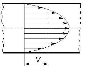 Рассмотрим движение жидкости в трубе круглого поперечного сечения. В силу тормозящего действия сил вязкого трения распределение скоростей в поперечном сечении трубопровода (эпюра скорости) будет иметь вид, показанный на рис. 9.1. Для удобства перейдем к цилиндрическим координатам (r,