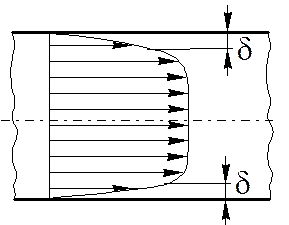 На рис. 12.2 приведен примерный вид поля осредненных скоростей (эпюра скорости) при турбулентном течении в трубопроводе. Следует обратить внимание на ее большую наполненность (большую равномерность) по сравнению с ламинарным течением. Это объясняется тем, что вследствие перемешивания частиц за счет турбулентных пульсаций происходит обмен количеством движения и, как следствие, более равномерное распределение скоростей в поперечном сечении.