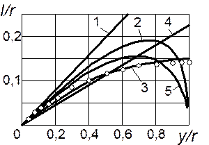 Существенно отличаются от опытной и кривые, полученные другими авторами: Карманом (кривая 2), Конаковым (кривая 4), Саткевичем (кривая 5). Достаточно близка к эксперименту кривая Альтшуля (кривая 3), описывающая длину пути перемешивания с помощью формулы