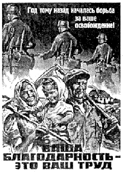 Немецкая администрация терпеливо ждала один год, учитывала трудности молотьбы и т.д. в надежде, что эти не выполняющие своего долга крестьяне образумятся." (См. рис. 5 — немецкий плакат 1942 г.).