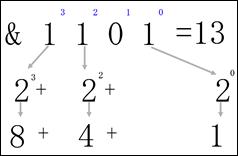 1101(2)=1* 2 3+1* 2 2+0* 2 1+1* 2 0=1*8+1*4+0*2+1*1=13(10)