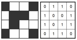Если пиксель изображения может быть раскрашен только в один из 2х цветов, допустим, либо в черный (0), либо в белый (1), то для хранения информации о цвете пикселя достаточно 1 бита памяти (log2(2)=1 бит). Соответственно, объем, занимаемый в памяти компьютера всем изображением, будет равен числу пикселей в этом изображении (рис. 20а).