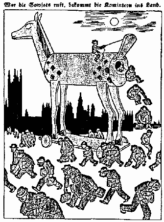 Рис. 13. "Кто позовет Советы, тот получит Коминтерн!" (Французская листовка 1939 г., изображающая Троянского коня, из чрева которого выпрыгивают агенты международного коммунизма).