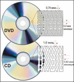 | Рис. 26. Сравнение плотности записи на CD и DVD. |