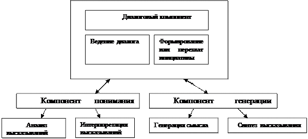 В соответствии с выделенными функциями, обобщенная схема ЕЯ- систем может быть представлена в виде трех компонентов: диалоговый, компонент понимания высказываний, компонент генерации высказываний.