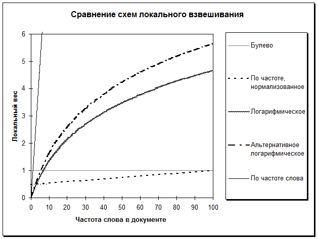 Сравнение различных стратегий локального взвешивания, для частот слов от 0 до 100 показано на рис.7. Предполагается, что максимальная частота, используемая в схеме (с), равна 100. Вес, основанный просто на частоте встречаемости слова (t) возрастает очень быстро, тогда как другие веса возрастают более медленно.