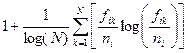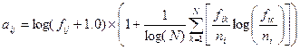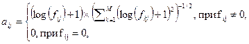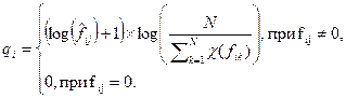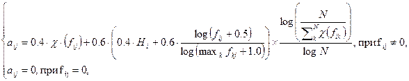 Энтропийное взвешивание. Это взвешивание основывается на предпосылках теории информации и является довольно сложной схемой взвешивания. В экспериментальных работах [34,35] показано, что данный подход является наиболее эффективным, по сравнению со всеми вышеописанными. Там же приводятся средние результаты работы на пяти коллекциях документов. В некоторых случаях эффективность энтропийного подхода на 40% превышает соответствующие показатели для простого взвешивания на основе частоты слова. Вес терма i в документе j определяется как:
