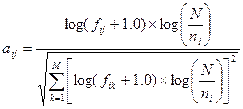 ITC взвешивание. Данная схема отличается от предыдущей тем, что использует логарифм частоты встречаемости слова, что позволяет нейтрализовать большие различия по частоте: