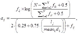 OKAPI взвешивание. Данный вид взвешивания, как и следующий за ним, описаны в [64]. Помимо формулы, применяемой для элементов матрицы терм-документ, они отличаются от предыдущих методов наличием взвешивания запроса. Формула взвешивания выглядит следующим образом: