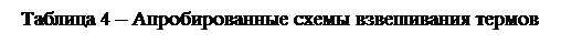 В таблице 4 приведены некоторые названия и кодировки схем взвешивания, которые реально применялись в задачах ип, данный список может быть полезен для поиска информации о результатах работы конкретных схем.