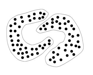 Так, если кластеры не имеют заранее установленной тенденции принимать примерно равные размеры (Рисунок 4 слева) и форму (Рисунок 4 справа), то динамическое определение этих параметров становится основным камнем преткновения большинства методов, как иерархических, так и, в особенности, разделяющих. Большая часть этих проблем решается выбором адекватного метода объединения кластеров.