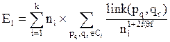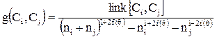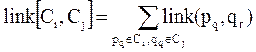 .Такое взвешивание предупреждает отнесение точек с низкими значениями связи к одному кластеру, поскольку это будет увеличивать ожидаемое число связей для кластера и уменьшать целевую функцию. Значение связи между кластерами определяется как: