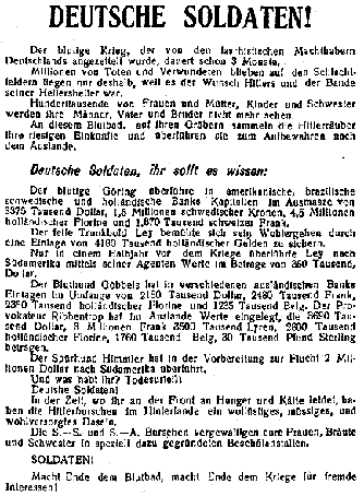 По форме, периодичности издания, разнообразию тем информационные листовки близки газете. Их оформление нередко включает элементы оформления газетной продукции: заголовок, разнообразные выделения в тексте и т. п. Тем не менее, пропагандистская направленность таких листовок совершенно очевидна. В лучших из них чувствуется стремление, не навязывая противнику своих выводов, дать возможность говорить самим фактам, которые помогут читателю понять истинное положение вещей и подскажут, что делать (см. рис. 18).