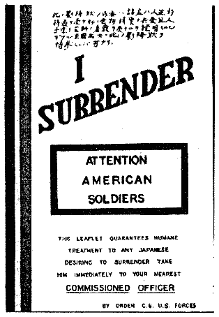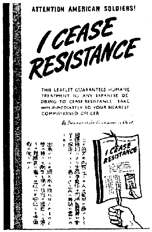 Рис. 23. В этой листовке оскорбительные слова "Я сдаюсь!" заменены словами "Я прекращаю сопротивление!". Кроме того, был добавлен рисунок, показывающий, как надо держать листовку, чтобы американские солдаты не думали, будто в своей руке японец держит гранату.