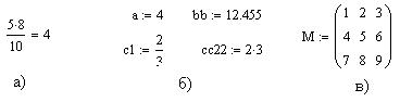 В MathCAD используются числовые или символьные данные (величины). Для числовых данных можно записать программу, пример которой показан на рис. 3.1а. Числа и знаки математических операций можно вводить с помощью «мыши» из меню «Арифметические инструменты» или через клавиатуру («*» - умножение, «/» - деление и т.д.). Вывод результата обеспечивается командой (символом) «=».