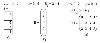 Одномерный массив (матрица - столбец) может задаваться перечислением, как показано на рис. 3.2а. Первое число соответствует начальному элементу массива, второе (вводимое через запятую) - следующему элементу (их разность равна приращению), а третье (вводимое через символ точка с запятой) – последнему элементу массива чисел. Результат представлен ниже записи массива на рис. 3.2а и получен вводом символа «=».