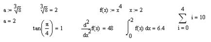 В программе MathCAD реализован широкий набор операторов (алгоритмов преобразования чисел) в меню «Арифметика», «Математика», «Матрицы». Это простые операторы (сложение, вычитание и т.д.), простые функции (тригонометрические, экспоненциальная, степенная функции и т.д.), суммы, произведения, производные и интегралы, матричные операции. Примеры применения операторов и функций показаны на рис. 3.3.