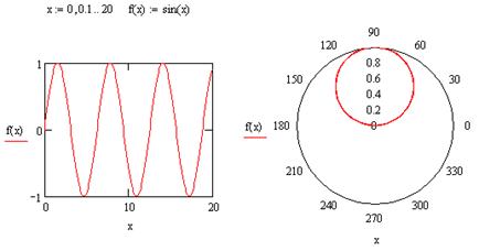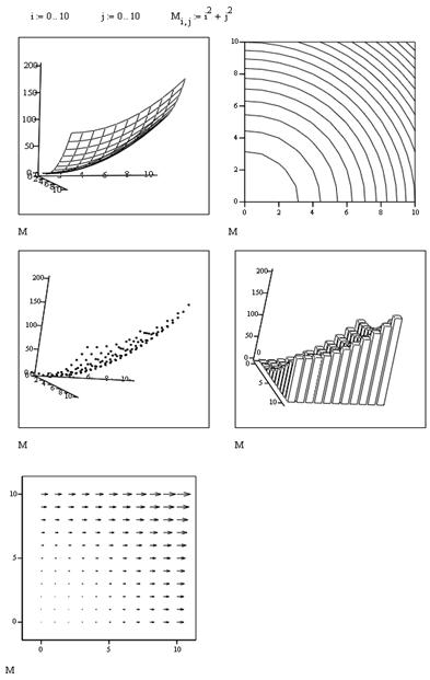 Программа позволяет строить графики функций и одномерных массивов в декартовых или полярных координатах (примеры показаны на рис. 3.4.). Имеется возможность построения трехмерных графиков функций или массивов двух переменных в виде поверхности, контурного или точечного графика, трехмерной диаграммы или векторного поля (соответствующие примеры приведены на рис. 3.5).