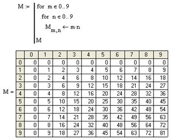 На рис. 3.7 показан пример применения оператора цикла for для вычисления таблицы перемножения целых цифр 0,1,...,9, результат приведен в таблице на том же рисунке.