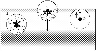 Выясним, чем обусловлено свойство сокращения поверхности жидкости. На рис. 3.2 изображены три молекулы и сферы их действия. Молекулярные силы, действующие на молекулу 1 со стороны молекул, находящихся в сфере молекулярного действия, взаимно уравновешиваются. В иных условиях оказывается молекула 2 на поверхности жидкости. Над ней имеется пар жидкости, действием молекул которого можно пренебречь. При таком условии молекулярные силы, действующие на молекулу 2, оказываются неуравновешенными, их равнодействующая R направлена в глубь жидкости перпендикулярно к её поверхности. В таком состоянии находятся все молекулы поверхностного слоя толщиной в радиус сферы молекулярного действия (приблизительно слой в 1-2 молекулы).