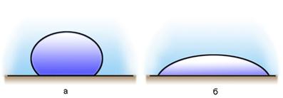 Рис. 3.3. Различные формы капли на поверхности твердого тела для случаев несмачивающей (а) и смачивающей (б) жидкостей