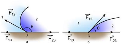 Рис. 3.4. Схемы к расчету равновесия капли на поверхности твердого тела для случаев несмачивающей (а) и смачивающей (б) жидкостей 1 - газ, 2 - жидкость, 3 - твердое тело