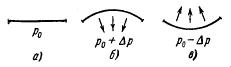 Если поверхность жидкости не плоская, то стремление ее к сокращению приведет к возникновению давления, дополнительного к тому, которое испытывает жидкость с плоской поверхностью. В случае выпуклой поверхности это дополнительное давление положительно (рис. 3.5, 6), в случае вогнутой поверхности — отрицательно (рис. 3.5, в). В последнем случае поверхностный слой, стремясь сократиться, растягивает жидкость.