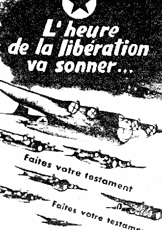 Рис. 37. "Придет час освобождения. Пишите завещание!" (Оригинальный прием: немцы в листовке для населения оккупированной Франции использовали заголовок листовки союзников, сделав к нему зловещее добавление).