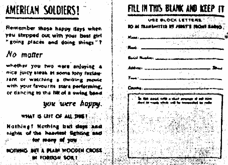 Рис. 38. Немецкая листовка 1944 г., пропагандирующая сдачу в плен. В ней соединен текст из радиопередачи, пропуск и бланк для почтового сообщения семье о своей судьбе. ("Американский солдат! Помнишь те счастливые дни, когда ты развлекался и веселился со своей любимой девушкой?.. Ничего не осталось, кроме упорных боев днем и ночью, а для многих из вас остался только простой деревянный крест на чужбине!").