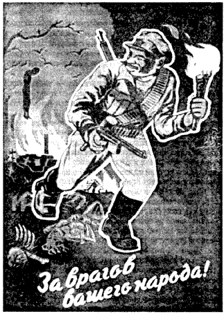 В иллюстративном оформлении пропагандистских материалов использовались стандартные клише, выработанные нацистами. Так, большевиков принято было изображать с тупым азиатским или гориллоподобным лицом, с кинжалом либо дубинкой убийцы, с факелом поджигателя (см. рис. 39). Евреев рисовали с крючковатым носом, толстыми губами и выпученными глазами, с коварным и хитрым выражением лица.
