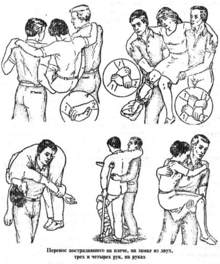 Для извлечения пострадавшего из стесненных выработок могут быть использованы методы перетаскивания. Переноска пострадавшего на короткое расстояние одним человеком проводится на руках, на спине или на плече. Два человека могут переносить пострадавшего на руках в лежачем или сидячем положении. Лучше эвакуировать пострадавшего на носилках, укладывая в соответствующее положение.