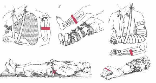 Иммобилизацию переломов нижней конечности проводят в прямом положении ноги или при незначительном сгибании в коленном суставе и расположенном под прямым углом к голени стопой. При переломе бедра наружную шину накладывают на протяжении от стопы до подмышечной области, внутреннюю- до паха. Иммобилизацию переломов голени проводят двумя деревянными планками, которые фиксируют по бокам от конечности до верхней трети бедра. Допустима иммобилизация бедра и голени методом «нога к ноге». У лиц, попавших под обрушение, может развиться тяжелое поражение- синдром длительного раздавления. При извлечении пострадавшего из- под завала в первую очередь освобождают голову и верхнюю часть туловища для доступа воздуха и проведения, при необходимости, сердечно- легочной реанимации. На поврежденную конечность накладывают тугую повязку марлевым или резиновым бинтом, сверху вниз и после освобождения проводят ее шинирование.