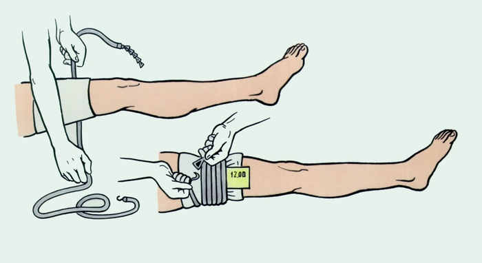 Чрезмерное затягивание жгута может стать причиной развития паралича конечности. Последующие 2-3 витка жгута накладывают с меньшим усилием без зазора между ними, рядом друг с другом. | |
