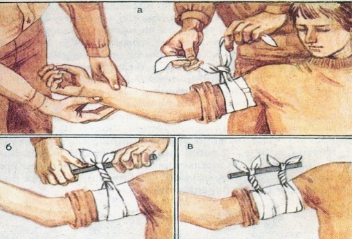 Подкладка на место наложения жгута; записка о времени наложения жгута; жгут накладывают на 1,5- 2 часа. летом и на 1 час зимой, по истечение указанного времени ослабляют на 5-7 минут; затем вновь наложение его несколько выше, но уже на 1 час летом и 30 минут зимой.