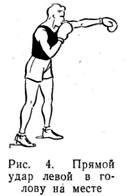 Прямой удар левой в голову на месте*. Из позиции дальнего боя толчком носка правой ноги боксер посылает тело вперед, перенося его вес на ступню левой ноги, выпрямленной в коленном суставе. Одновременно левая рука резко выпрямляется, туловище несколько поворачивается слева направо, кулак, подходя к цели, наклоняется вперед, кисть руки в момент нанесения удара сжимается. Раскрытой правой перчаткой, повернутой тыльной частью к подбородку, боксер страхует голову, а опущенным локтем — туловище** (рис. 4).
