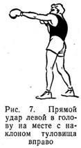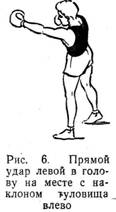 Прямой удар левой в голову на месте с наклоном туловища влево*. Толчком носка правой ноги боксер посылает тело вперед, перенося его вес на ступню левой ноги, выпрямленной в коленном суставе. Одновременно он несколько наклоняется влево и вращается слева направо, левая рука при этом резко выпрямляется. Туловище и кулак направляются к цели. При наклонах туловища вправо или влево рука, а вместе с ней и кулак поворачиваются вправо или влево.